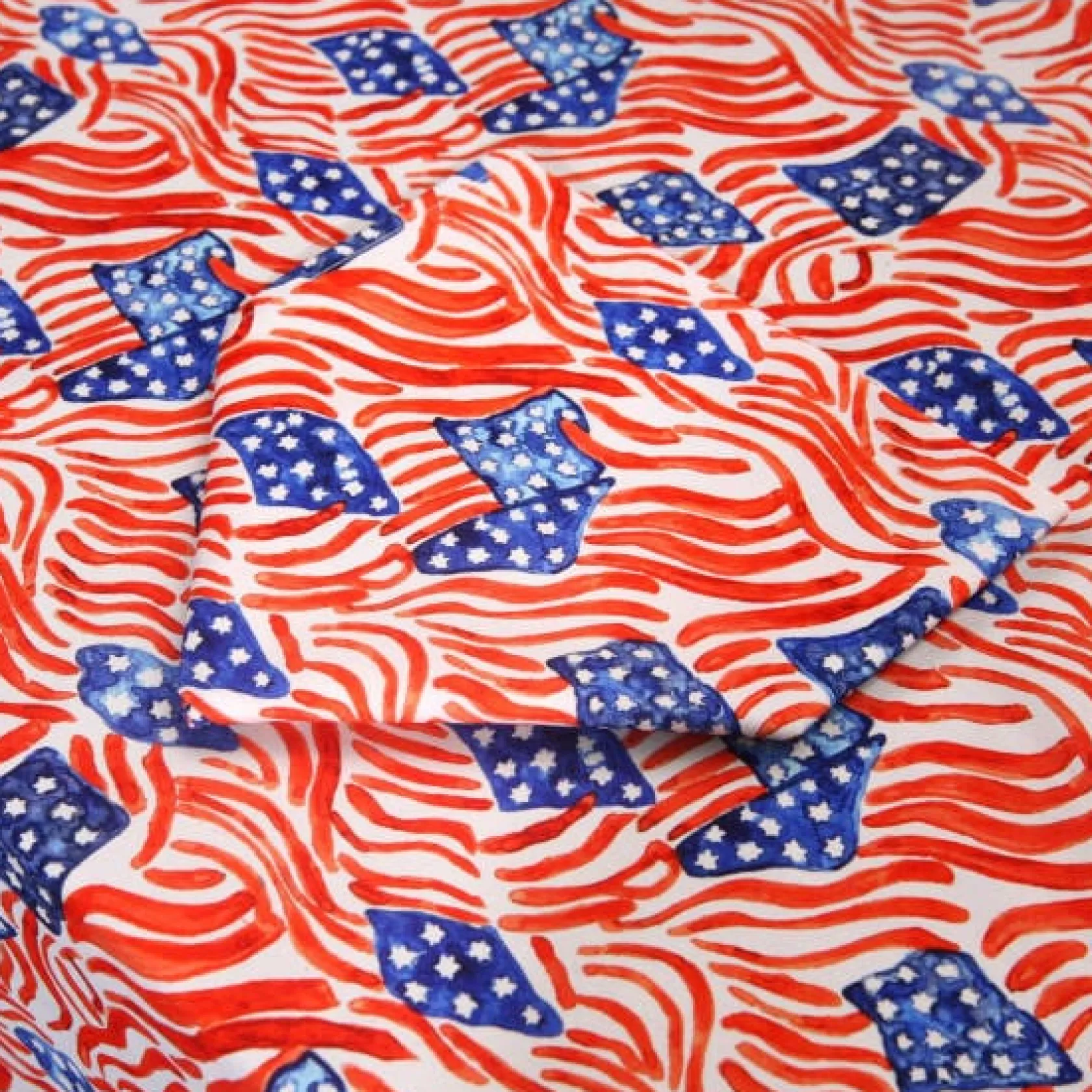 This stylized American flag patterned, rectangular tablecloth is perfect for Memorial Day, Fourth of July, and all celebrations of patriotism!
