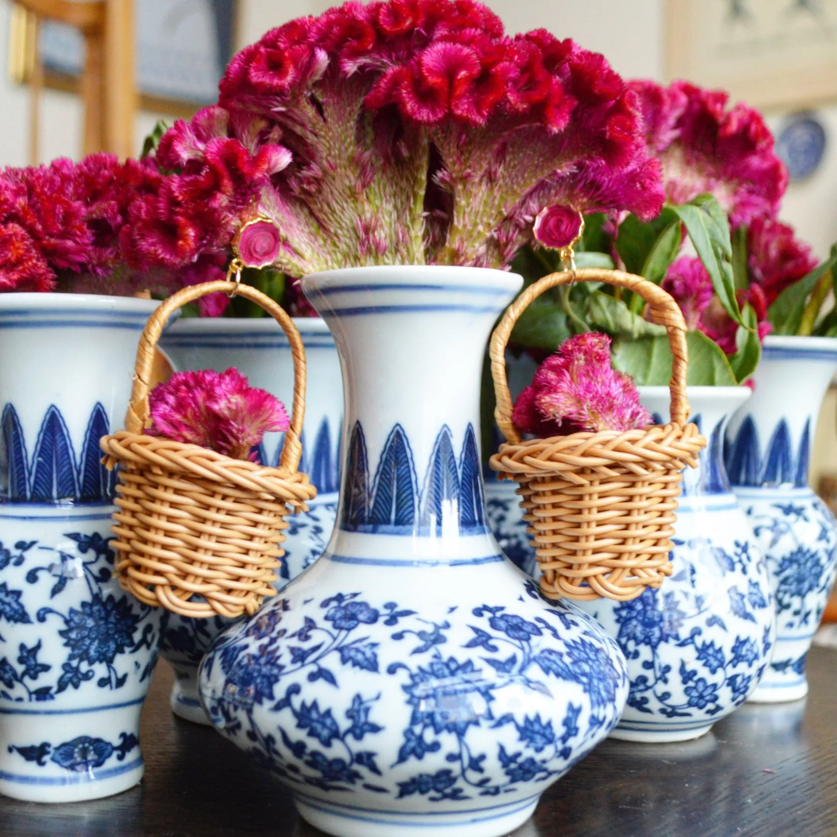 To match Chefanie’s iconic basket, we’ve created bold basket earrings to carry secret messages, chewing gum, or flower petals. The mini straw baskets hang from enamel clips inspired by Chefanie’s scalloped plate.