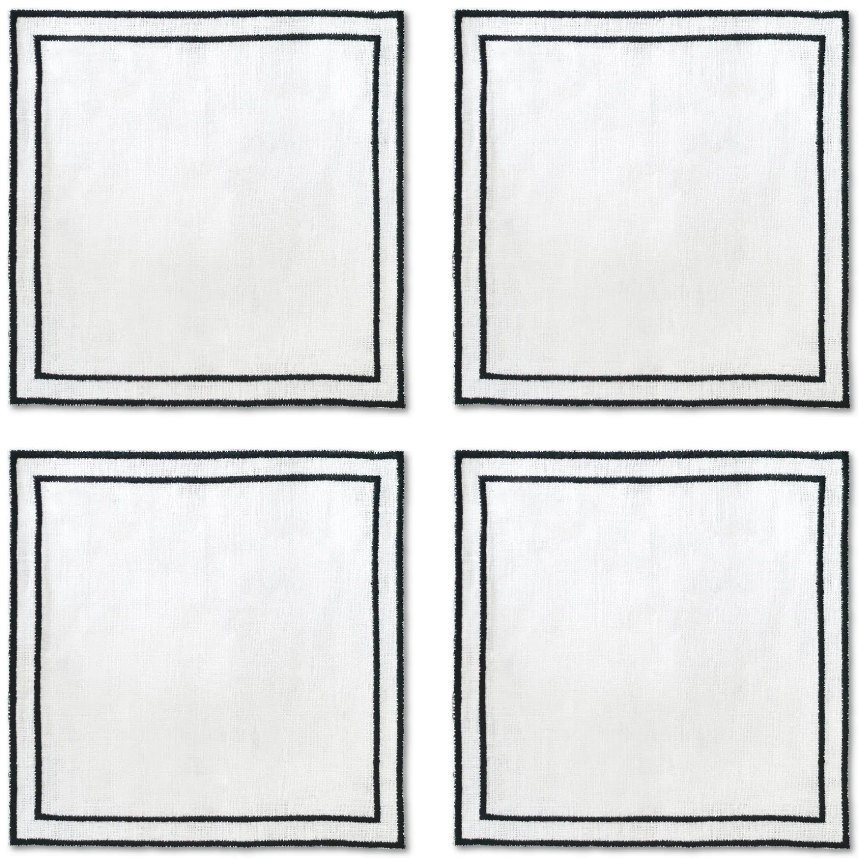 Classics are always in style. These white linen square cocktail napkins feature a clean black trim.