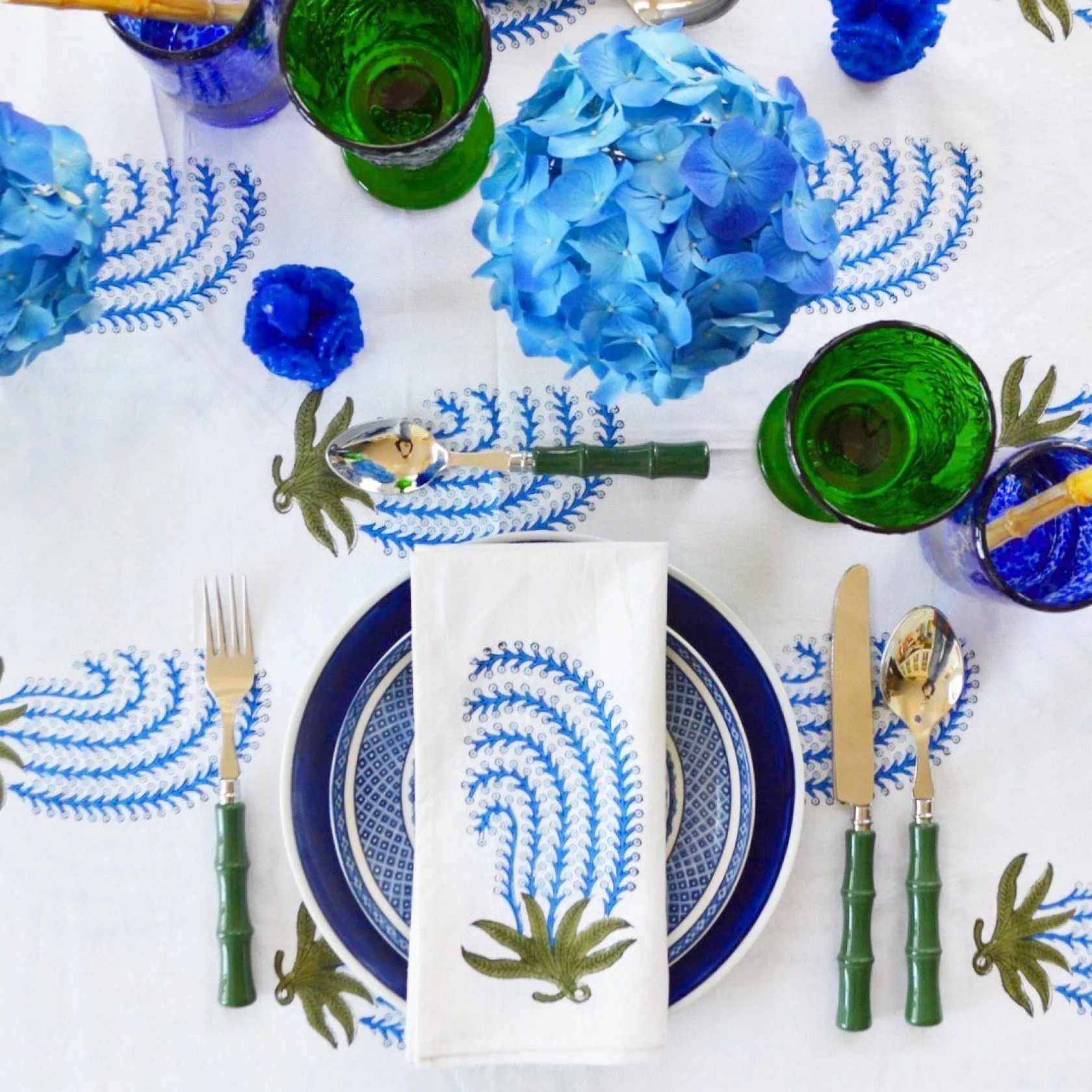 This set of 4 blue buteh block-printed napkins are 20 inches x 20 inches.