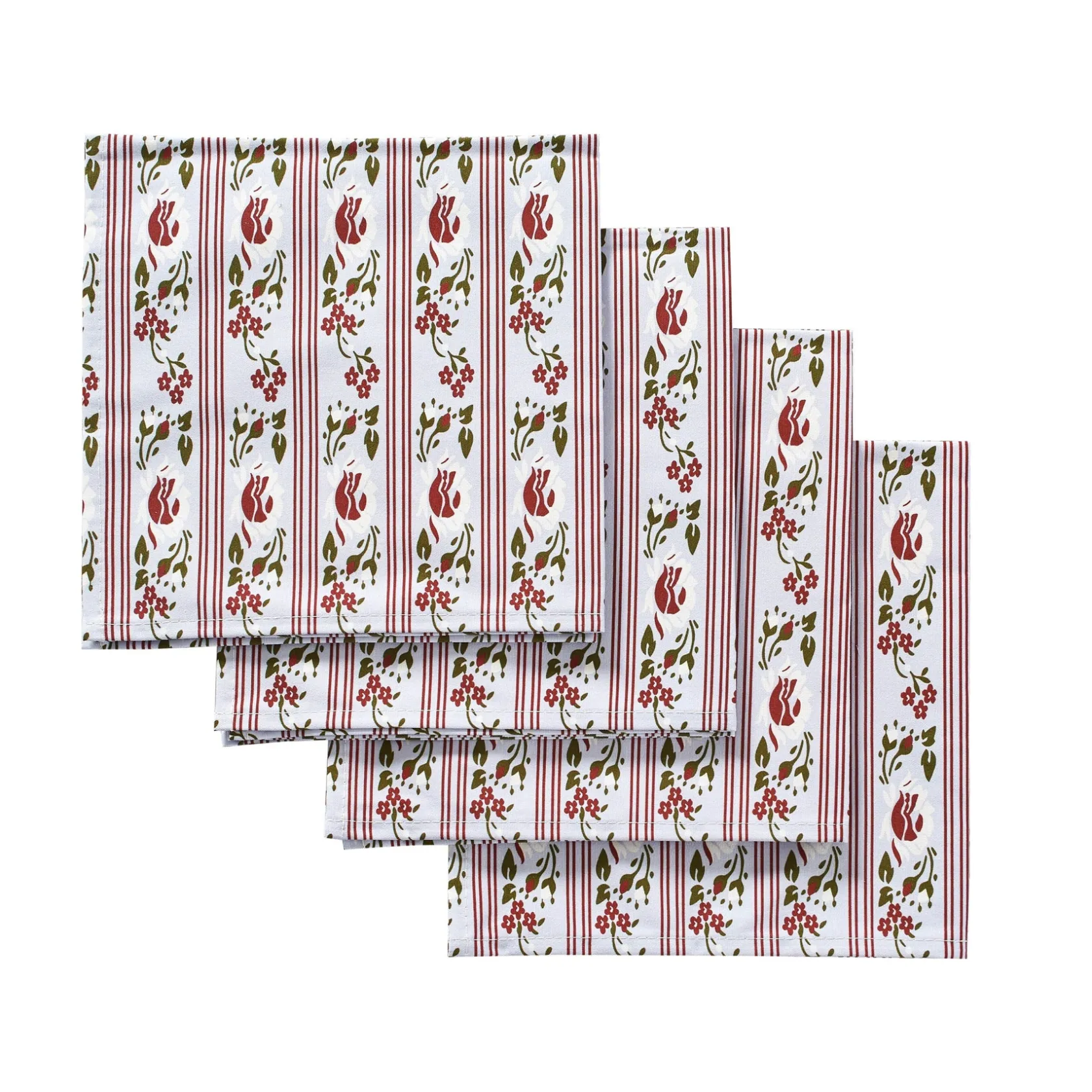 A pale blue napkin with burgundy, green, and white detailing to give the illusion of stacked ribbons.