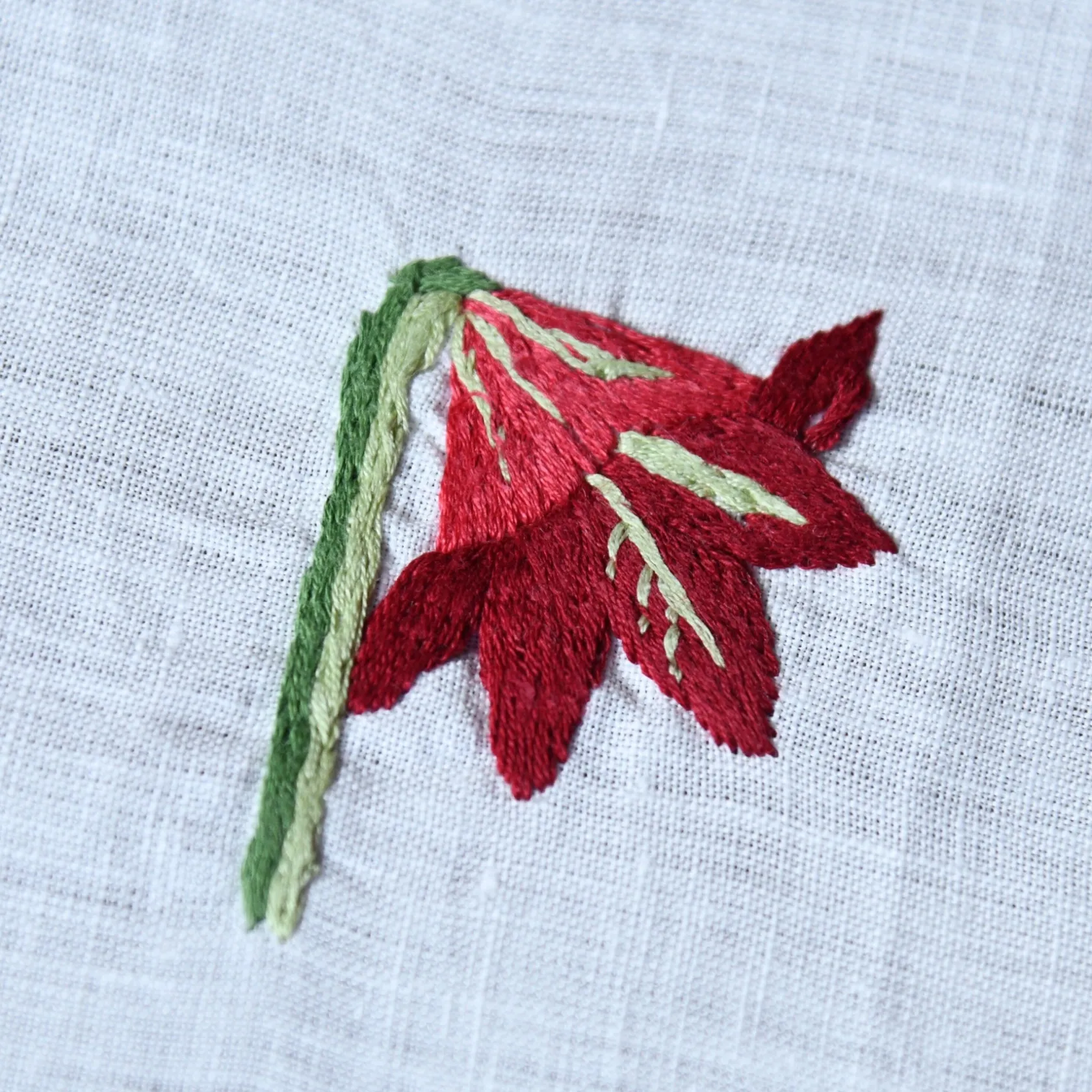 Botanical prints reinterpreted as a handmade linen tablecloth. Heirloom Christmas table covering with dozens of festive wintery motifs. All embroidery is done by hand! An heirloom.
