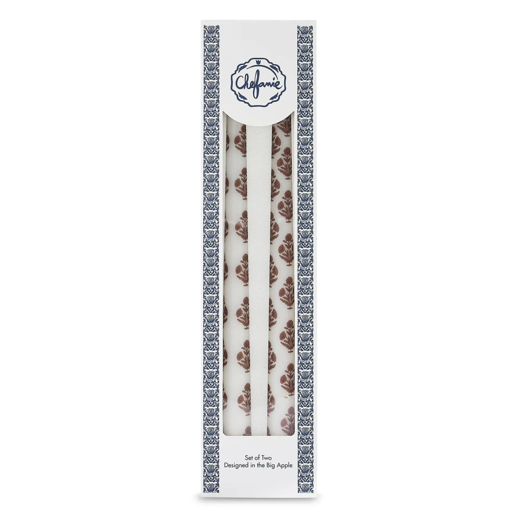 This set of 2 unscented taper candles is decorated to look like a block printed poppy. The motif is brown poppy flowers on a white taper candle.