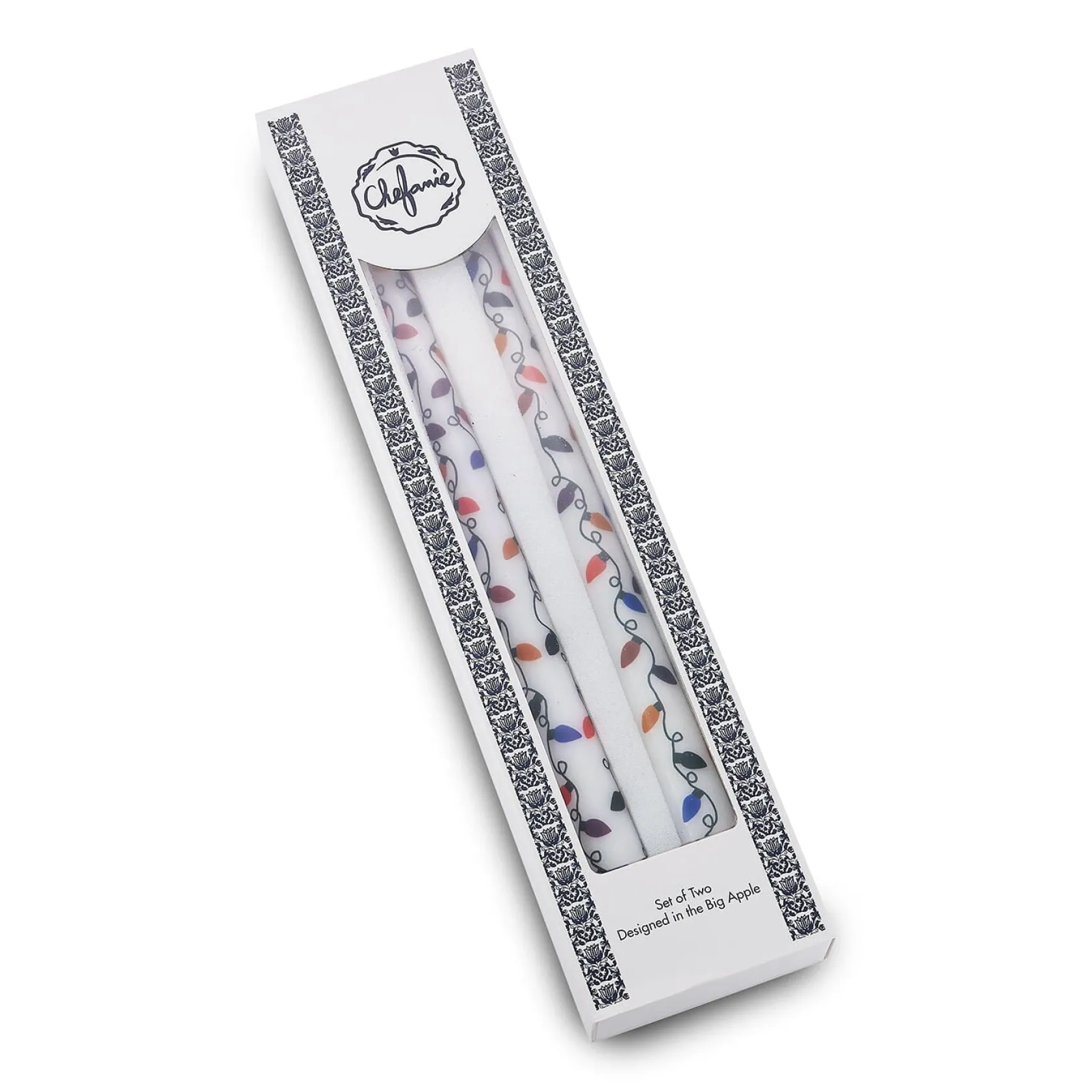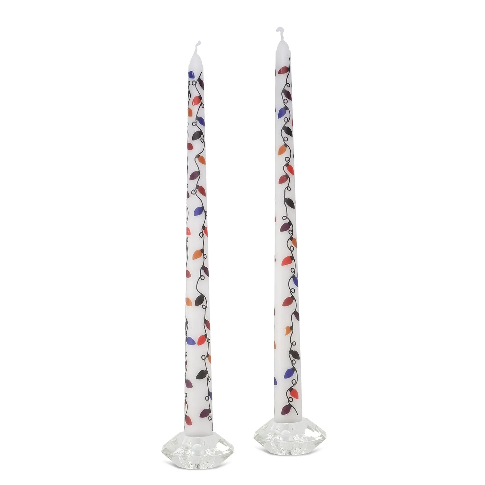 This set of 2 unscented taper candles is patterned festively. The motif is colorful Christmas lights on a white candle.