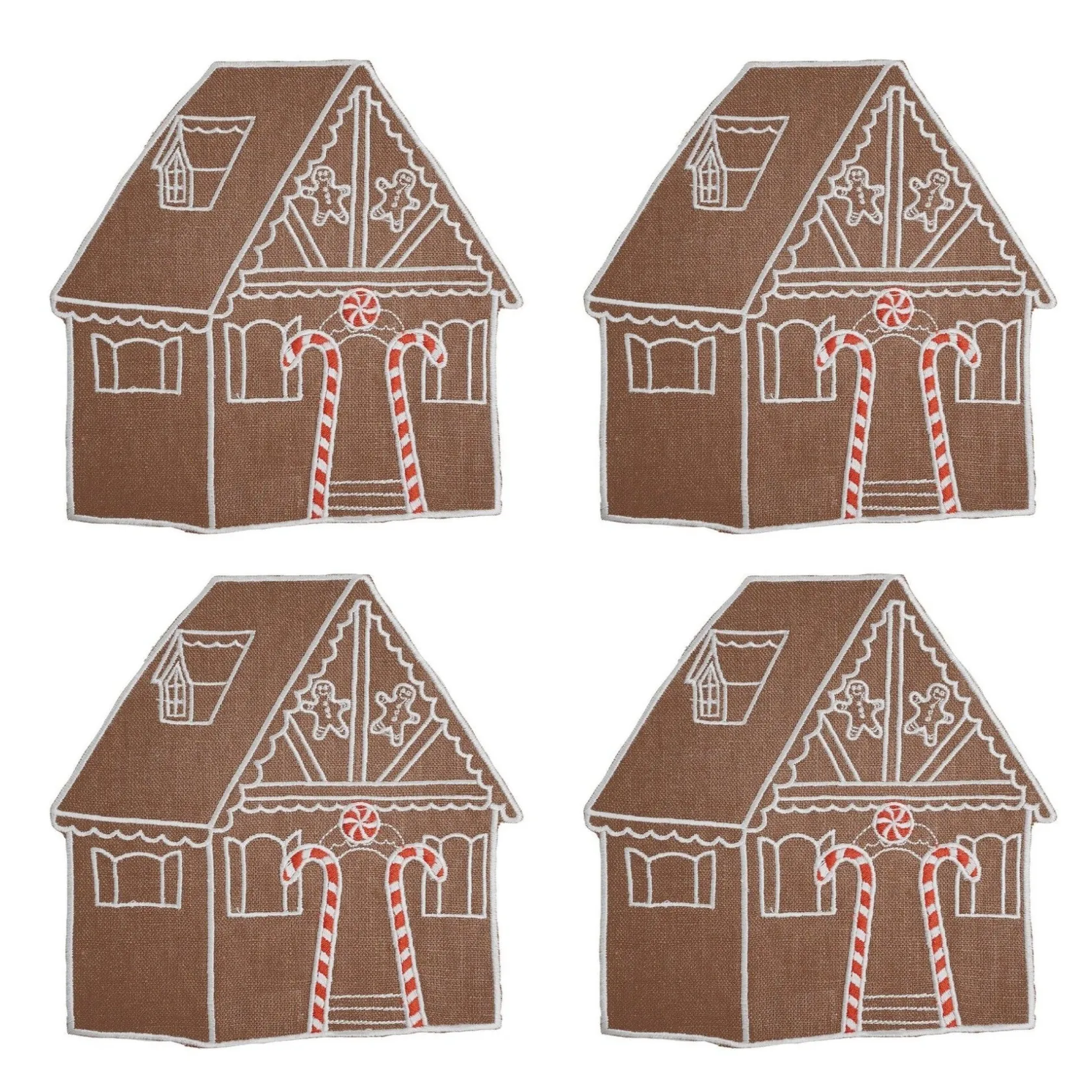 Shaped like a gingerbread house, these cocktail napkins might be the perfect accessory at a holiday party or gingerbread decorating event.