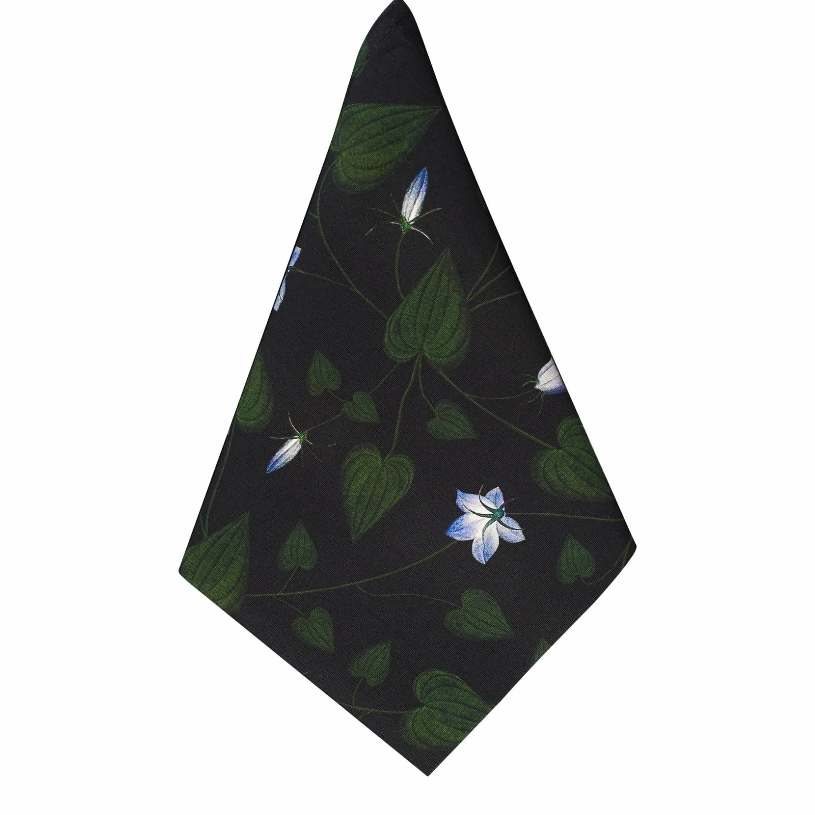 Napkins inspired by leaves naturally shaped like hearts and delicate blue bell flowers on a dramatic black background.