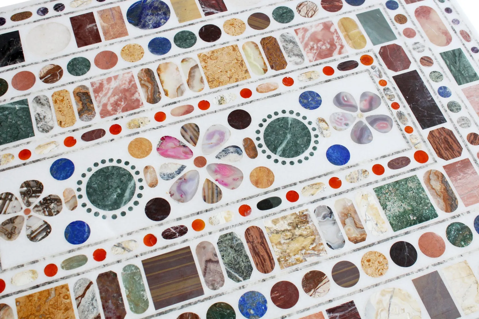 The perfect surface for aperitivo, coffee, or tea, this geometric marble tabletop is carved by hand with precious stones.