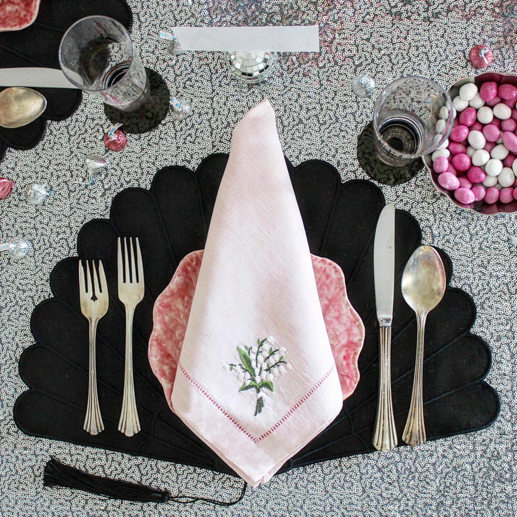Spring’s most fleeting flower is now permanently embroidered on these dinner napkins. The lily of the valley motif is perfect for spring entertaining: for Easter, Passover, or other occasions.
