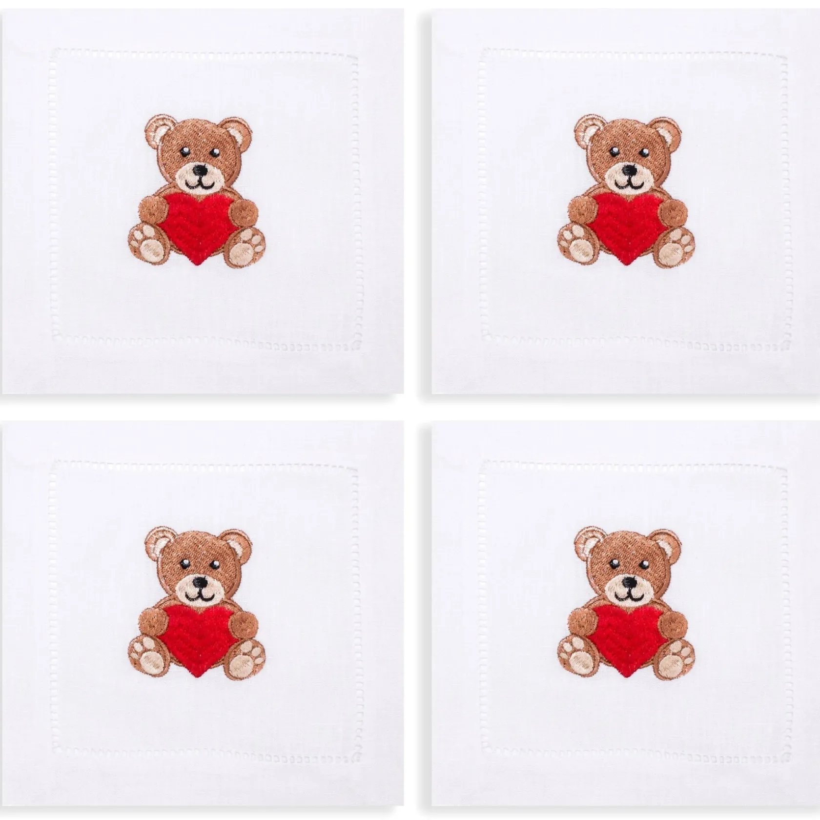 — Embroidered on white linen with hemstitch border.