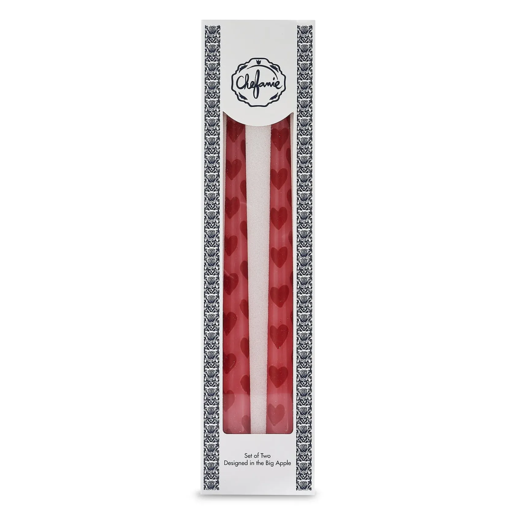 This set of 2 unscented taper candles is decorated with red hearts on a pink background.