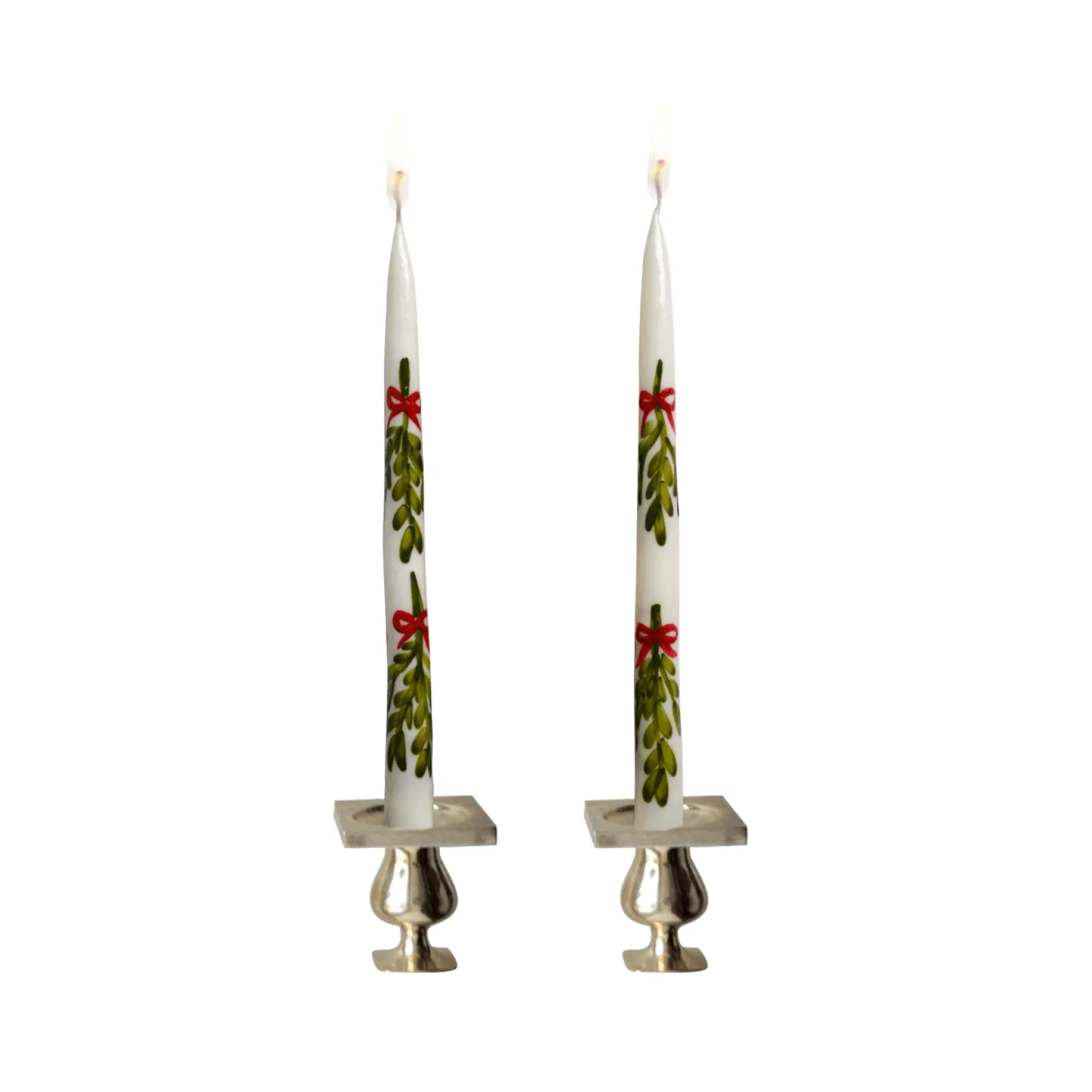This set of 2 unscented taper candles is painted by hand. The motif is green and red mistletoe leaves.