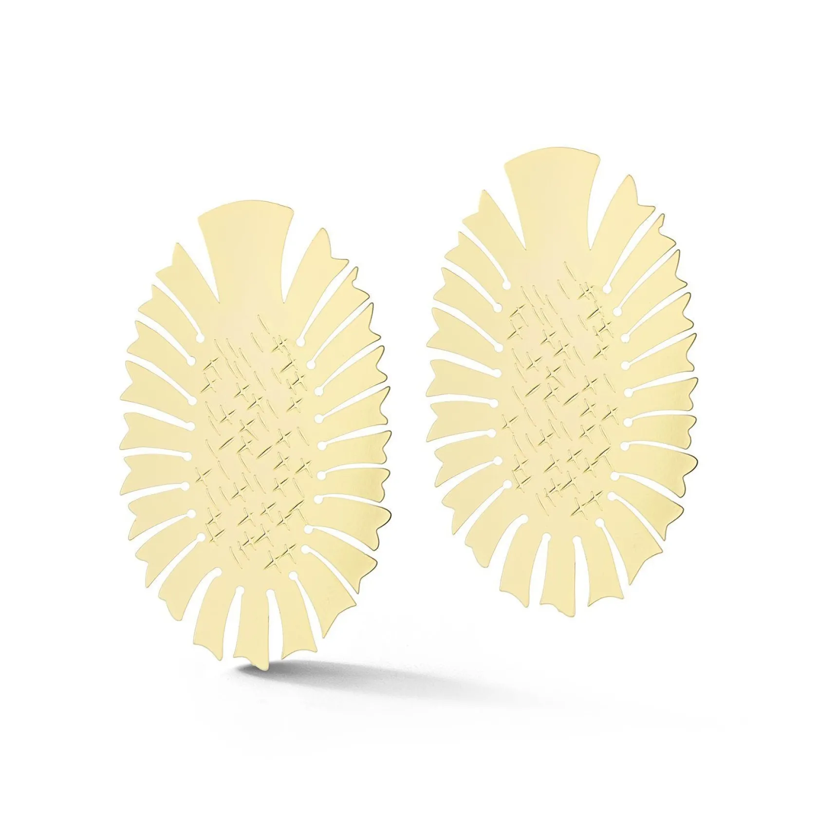 Each earring’s dimensions are approximately 2.5 inches tall and 1.5 inches across. They are paper thin.