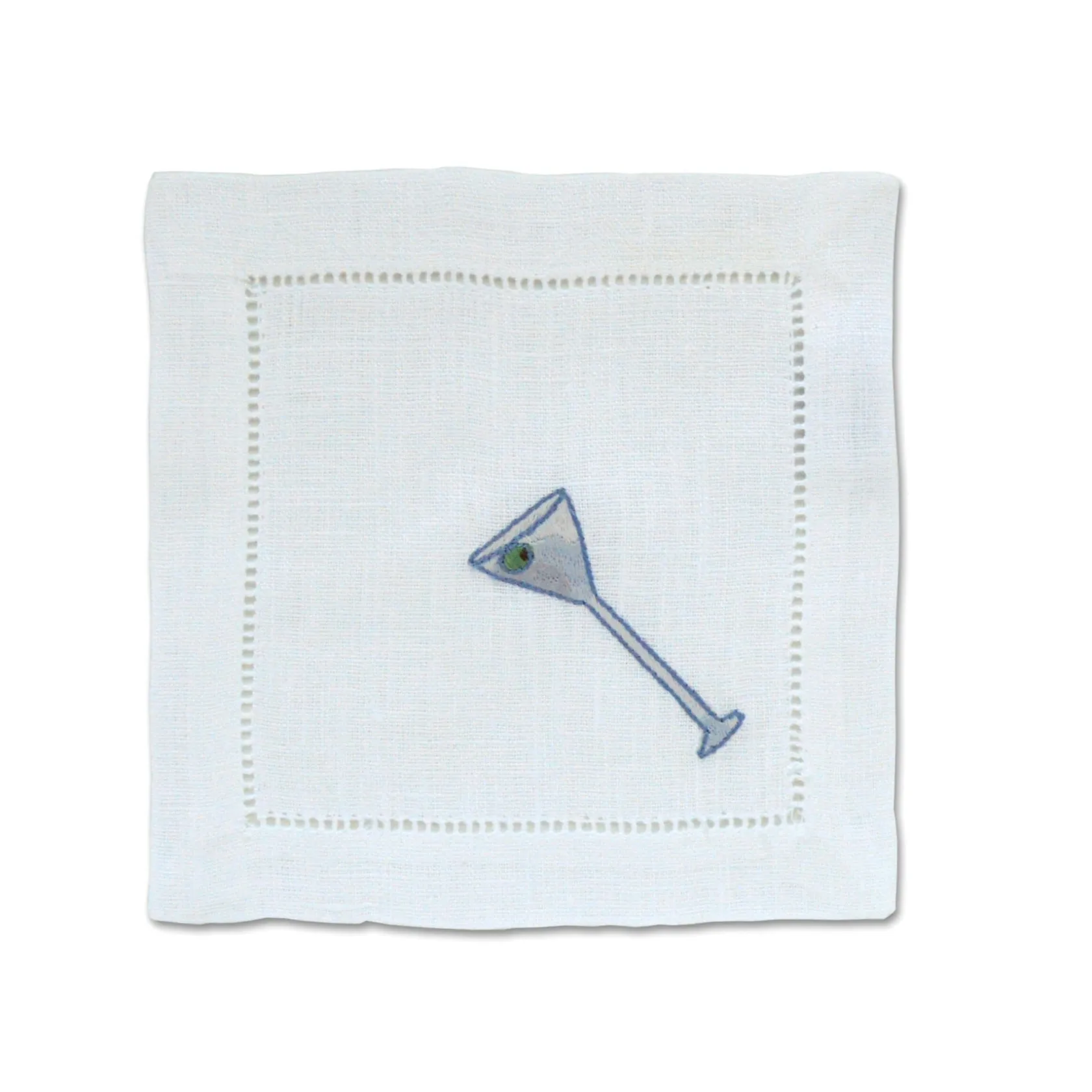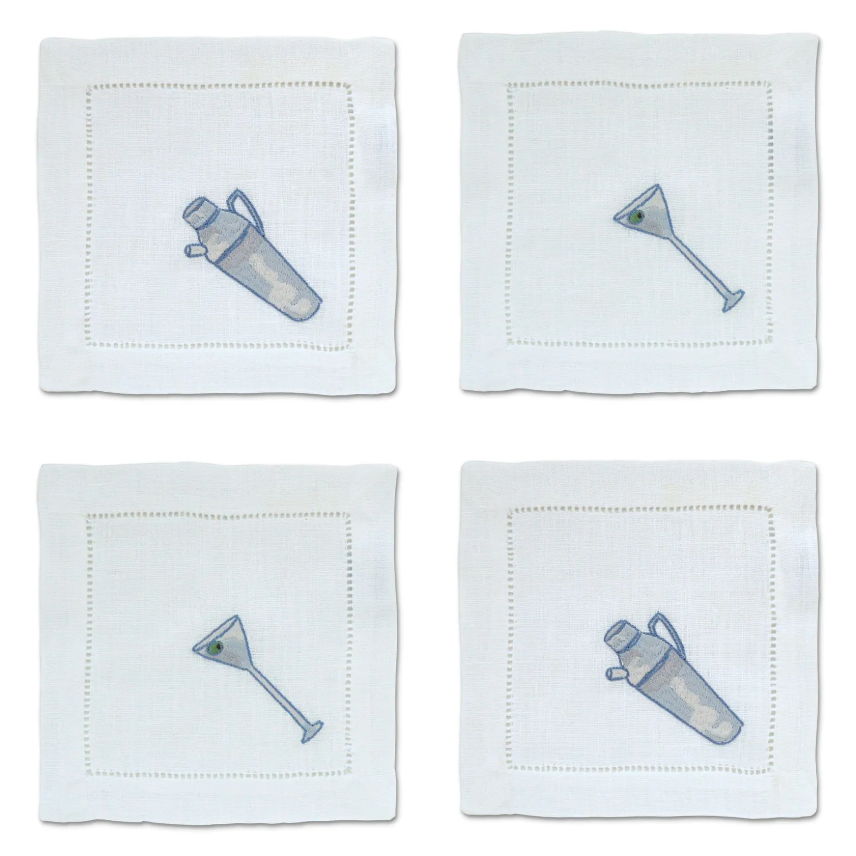 Cocktail napkins for martini lovers. Each set has 2 cocktail napkins with martini embroideries and 2 cocktail napkins with shaker embroideries.