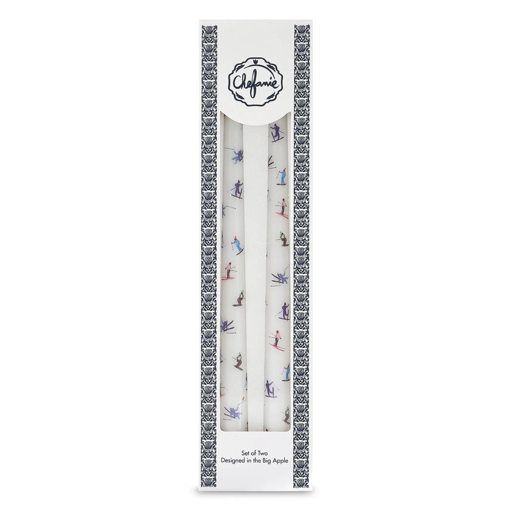 Athletic skiers race down this set of 2 unscented, white taper candles. Inspired by the view of the slopes from Ajax Tavern…