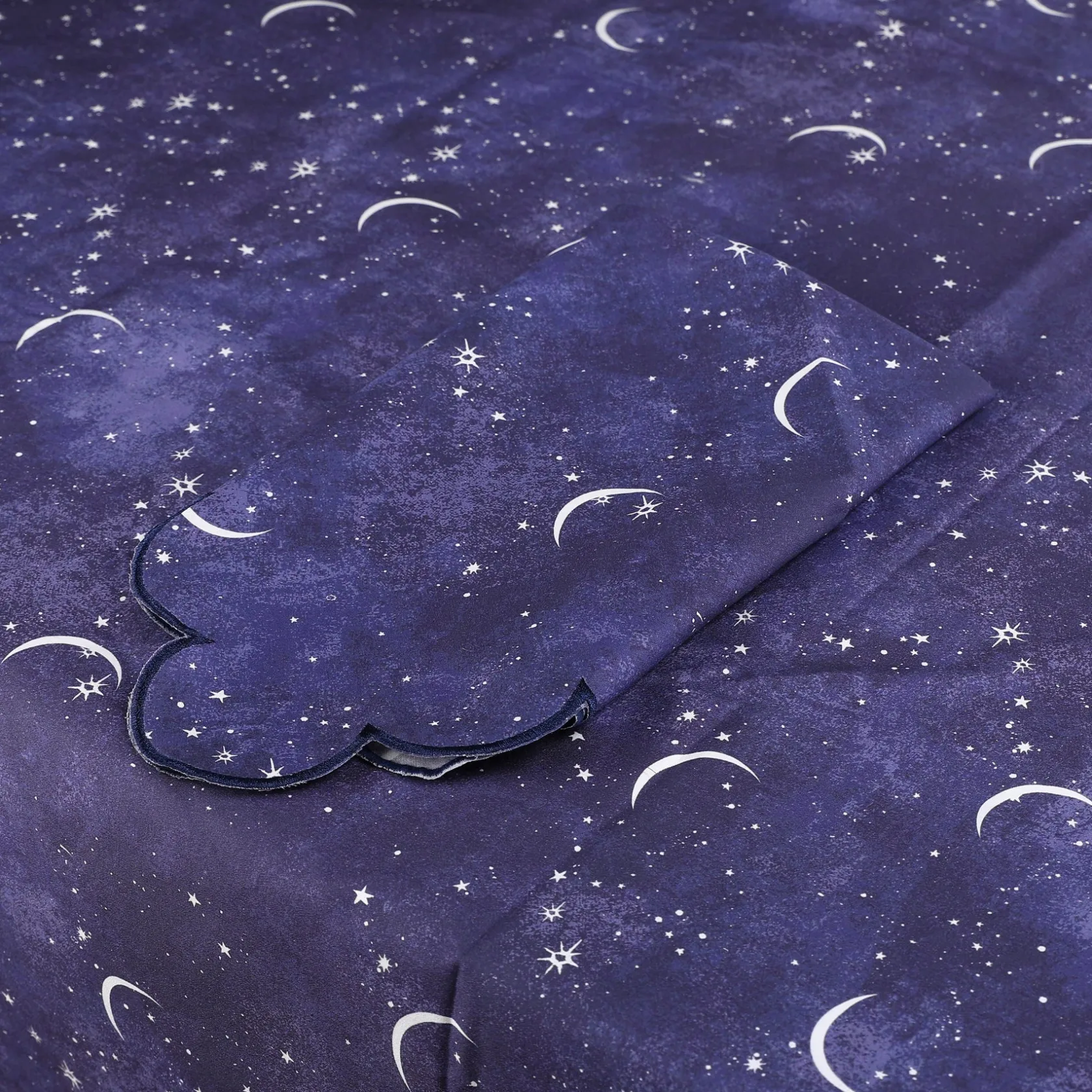 This starry sky patterned, rectangular tablecloth is 60 inches x 160 inches.