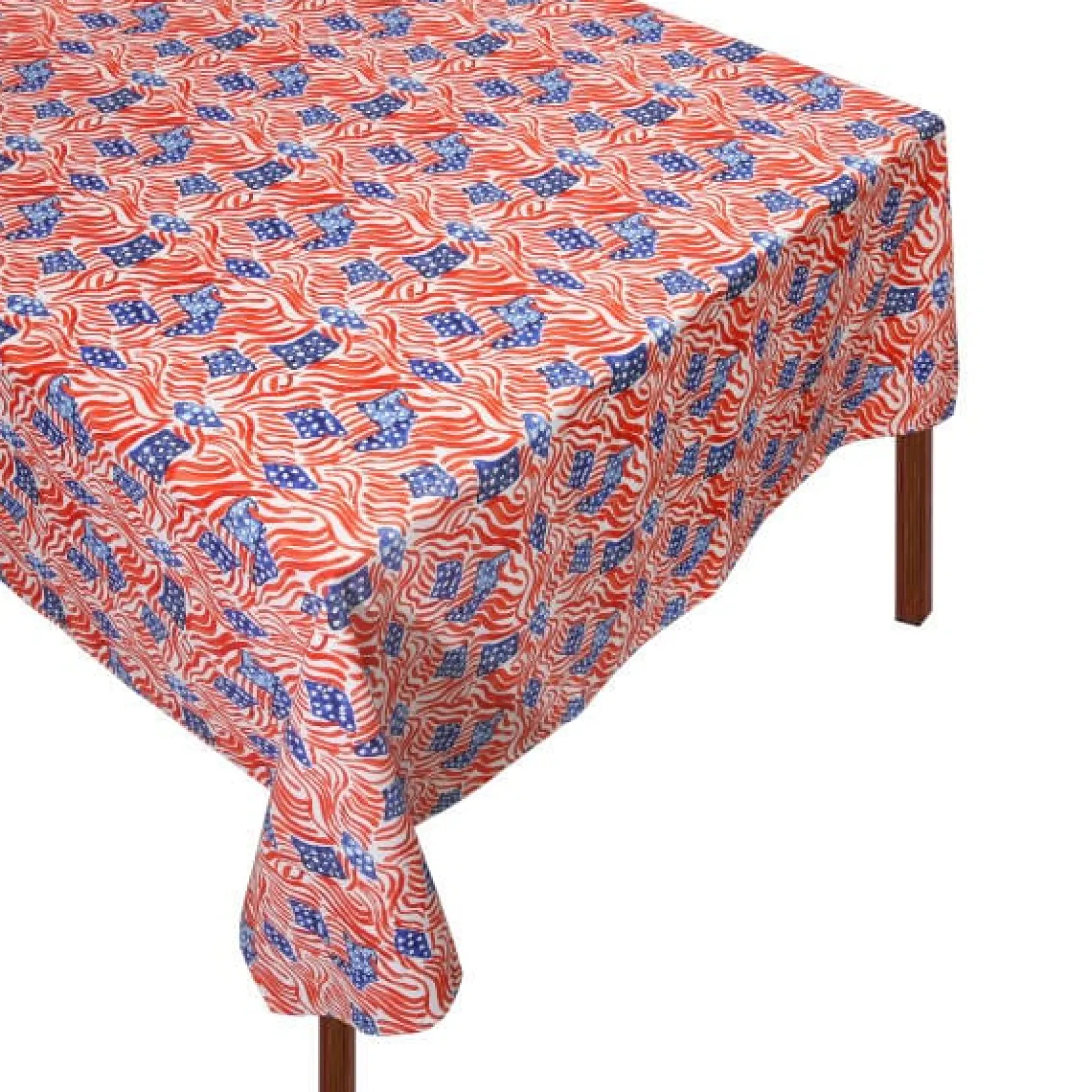 This stylized American flag patterned, rectangular tablecloth is perfect for Memorial Day, Fourth of July, and all celebrations of patriotism!