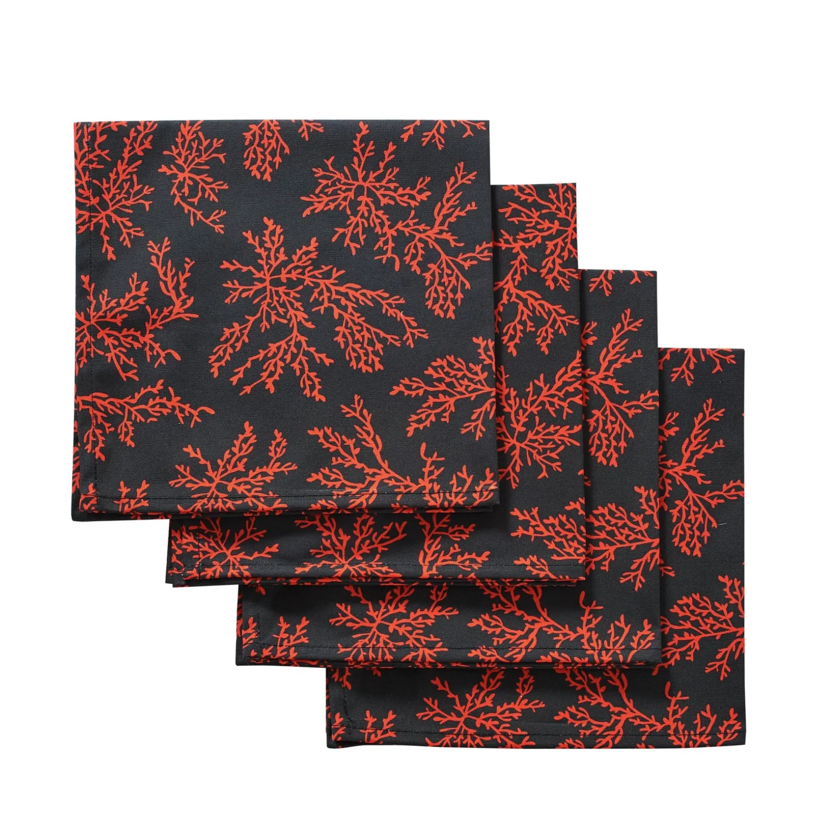 A dramatic printed cotton napkin set with red coral patterned throughout.