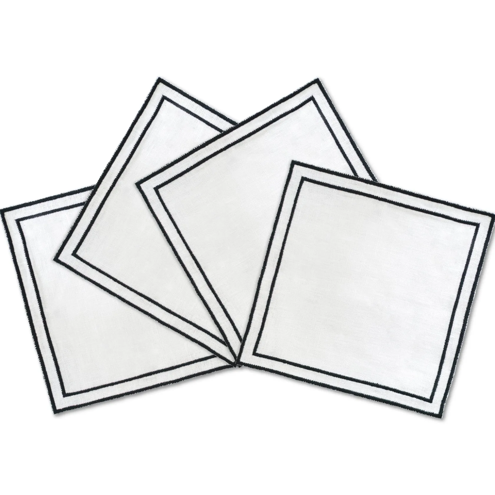 Classics are always in style. These white linen square cocktail napkins feature a clean black trim.