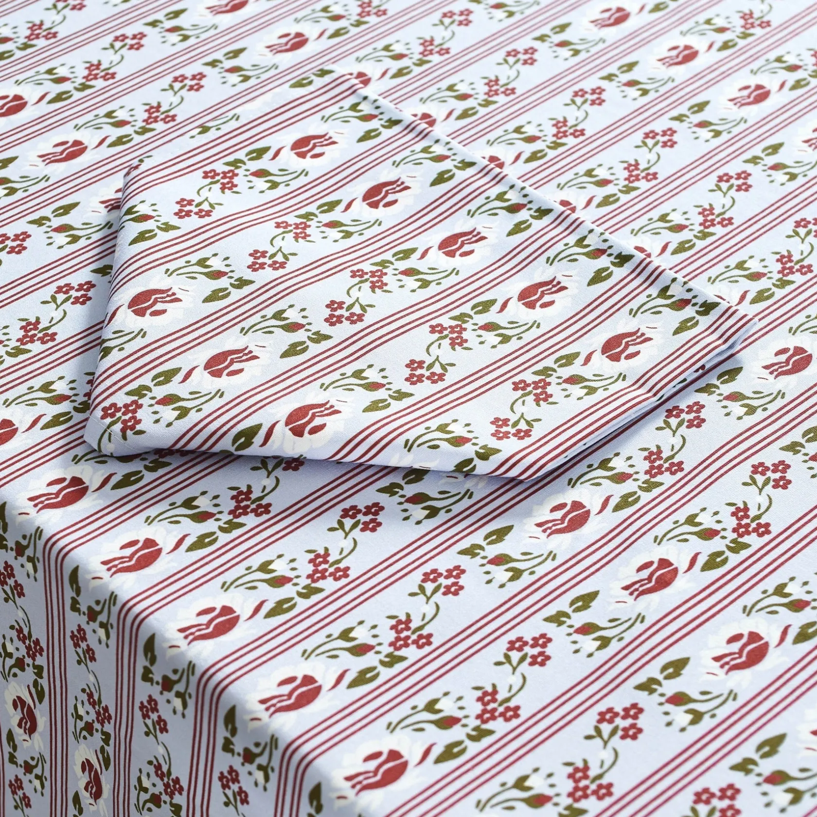 This sturdy rectangular tablecloth is patterned with long bands resembling charming ribbons