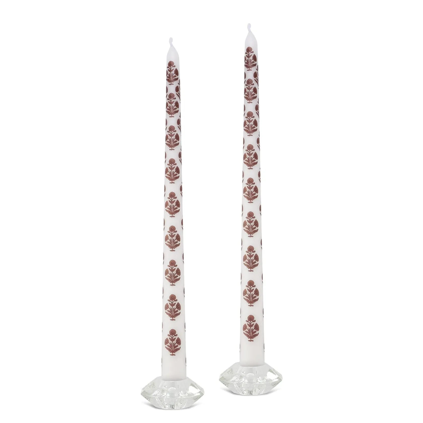This set of 2 unscented taper candles is decorated to look like a block printed poppy. The motif is brown poppy flowers on a white taper candle.