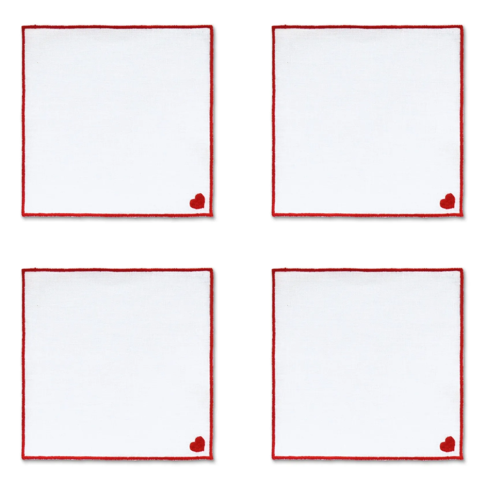 Classics are always in style. These white linen square cocktail napkins feature a clean red trim and bitty heart.