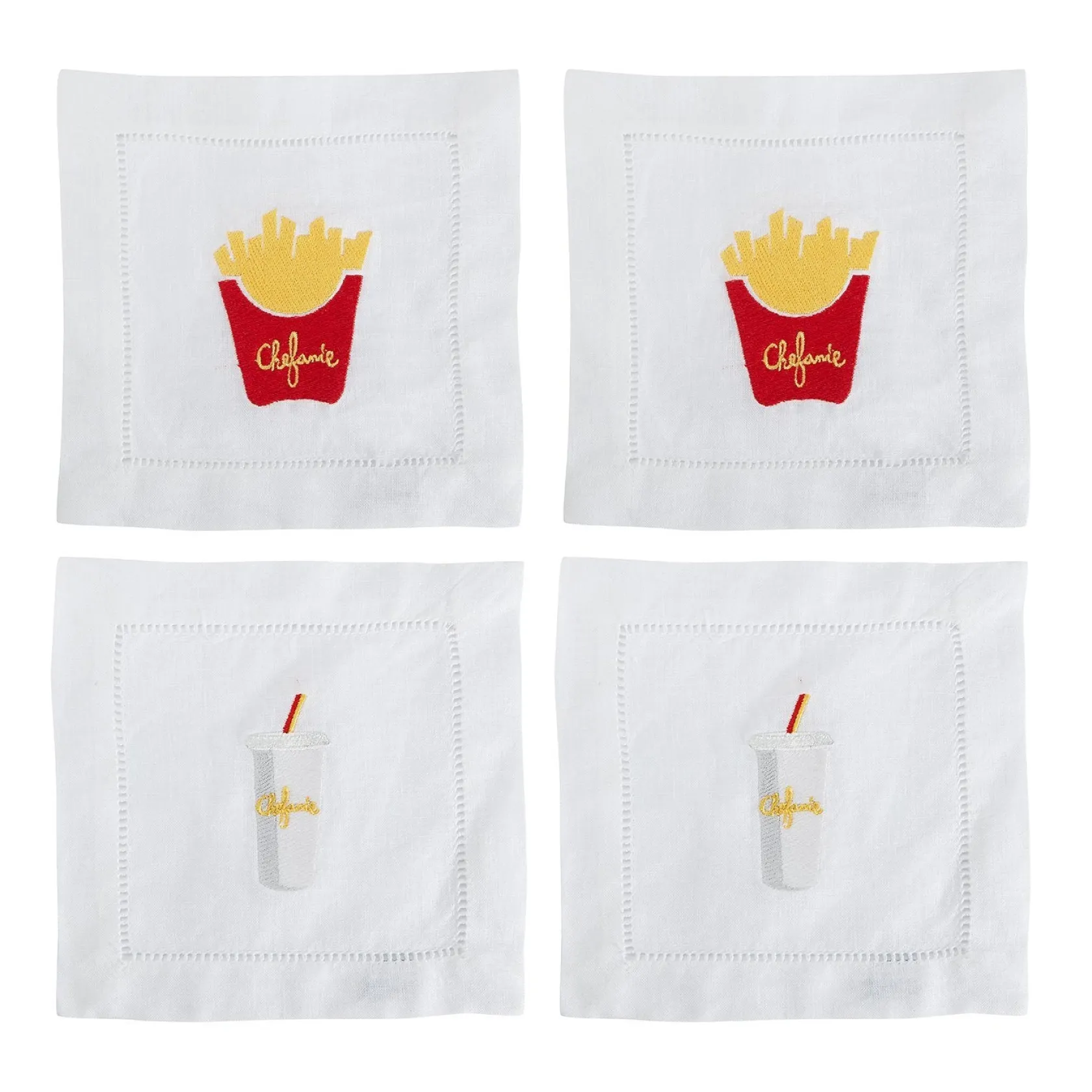 How else are you going to elevate your McDonald’s Dinner??? Even if you’re craving a big mac, you can be elegant. Each set of cocktail napkins includes the iconic fries and drink motifs– with the Chefanie touch.