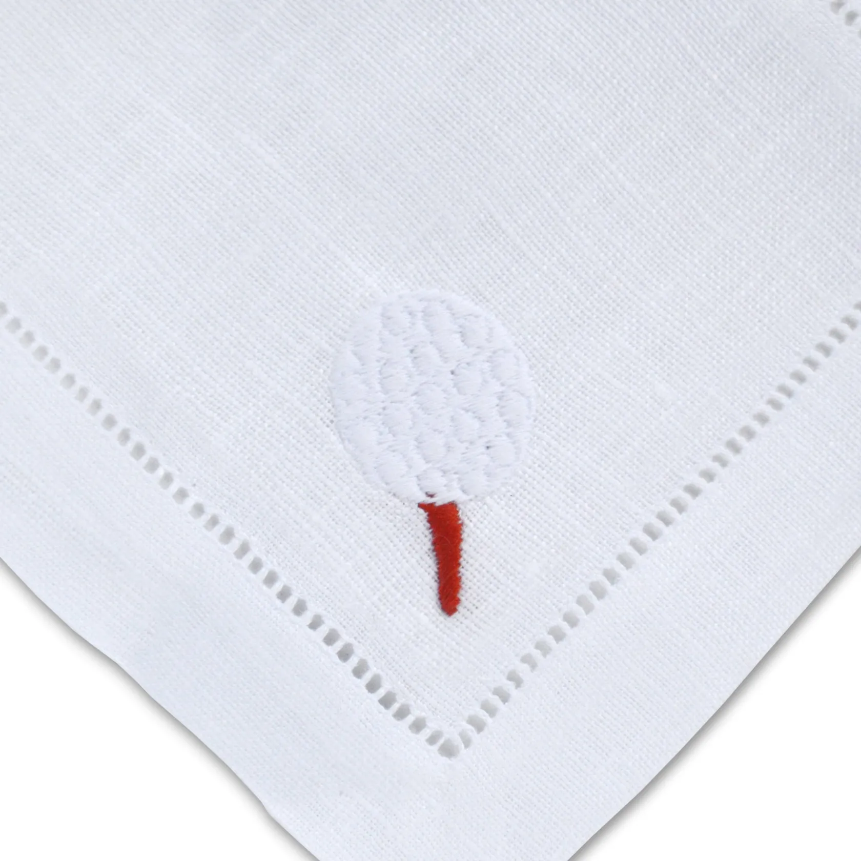 Cocktail napkins for golf lovers. Each set has 4 unique embroidered motifs: tees, golf ball, golf cart, and golf bag.