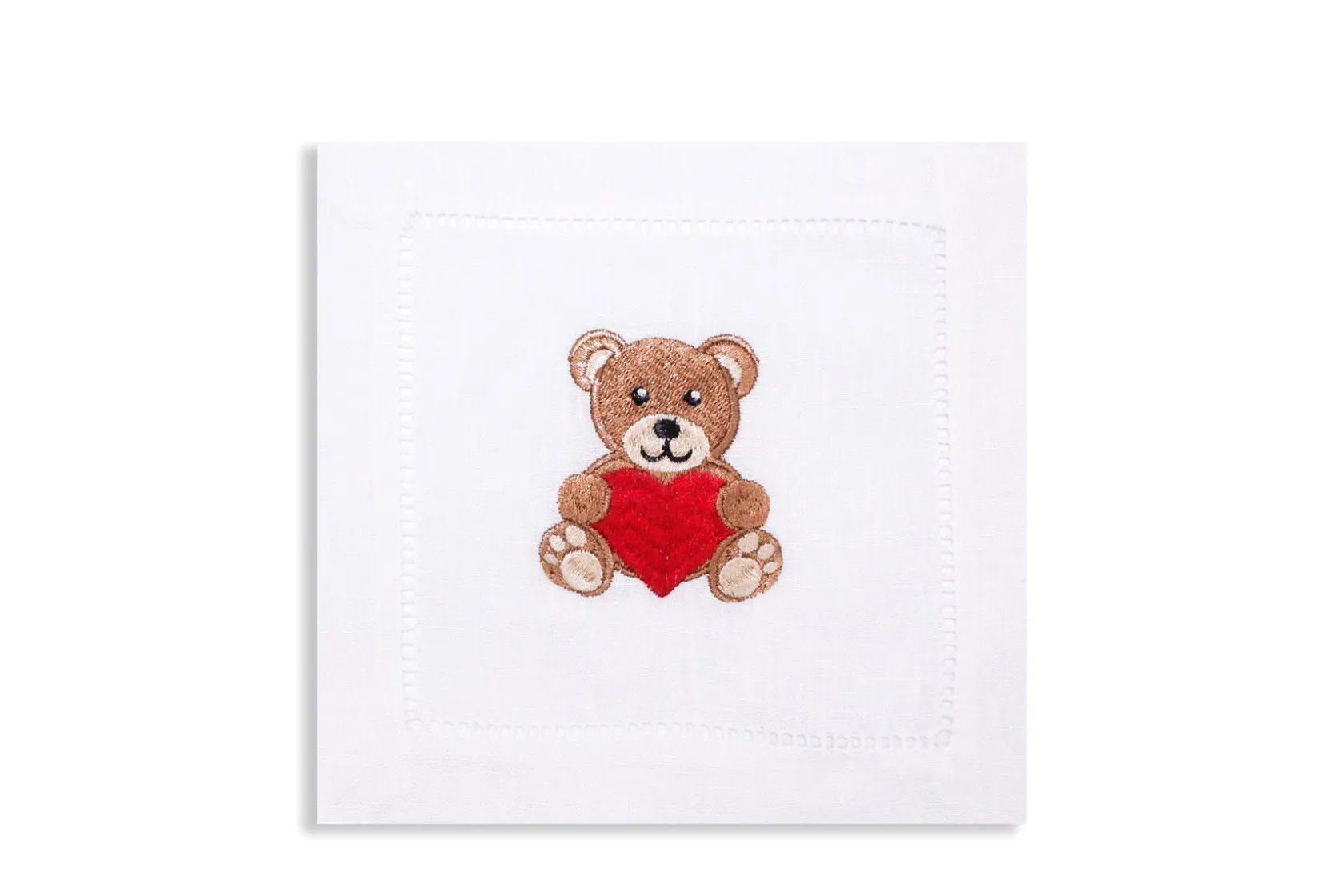 — Embroidered on white linen with hemstitch border.