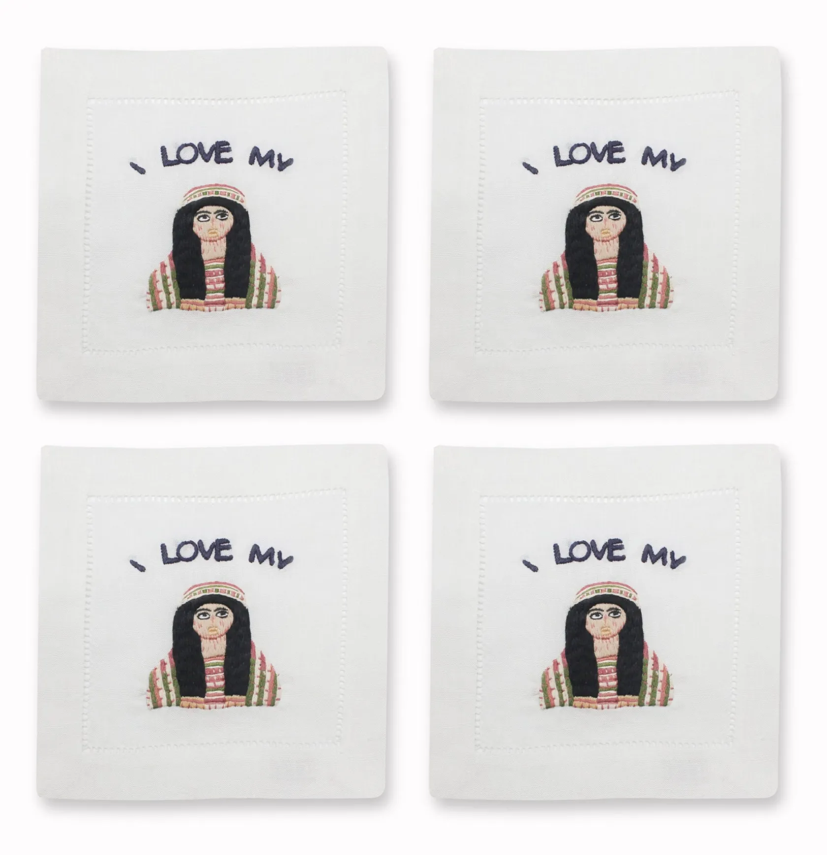 Embroidered on hemstitch linen napkin.