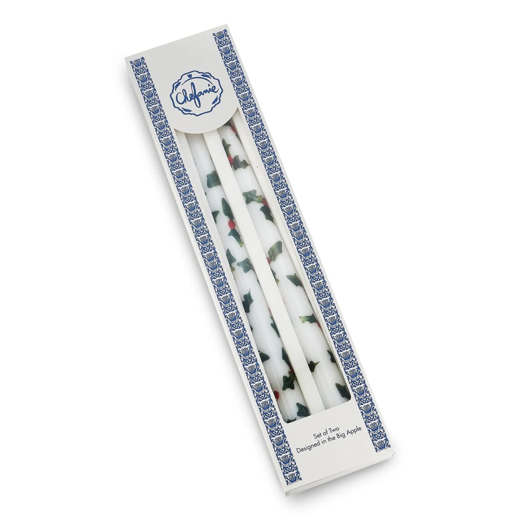 This set of 2 unscented taper candles is decorated with a red and green holly motif.