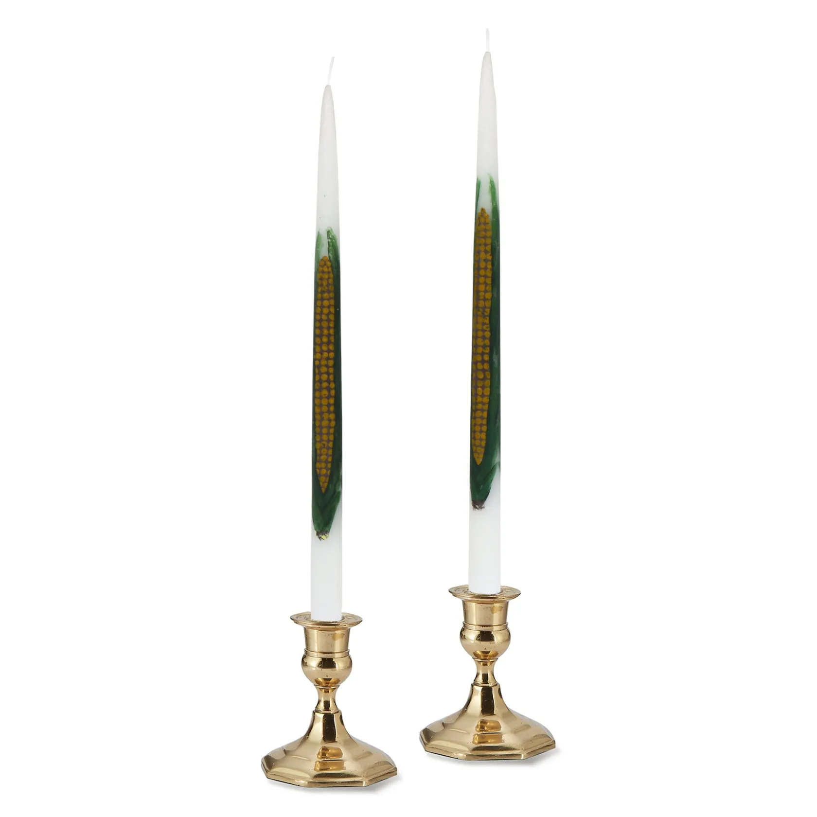 This set of 2 unscented taper candles is painted by hand. The motif is an ear of corn.