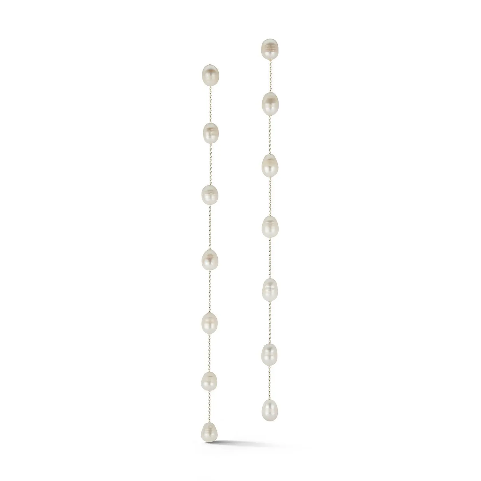 Seven pearls, on an 8.5 inch copper chain, swing across the shoulders . These earrings are for pierced ears and are equally lovely with a bathing suit as over a gown.