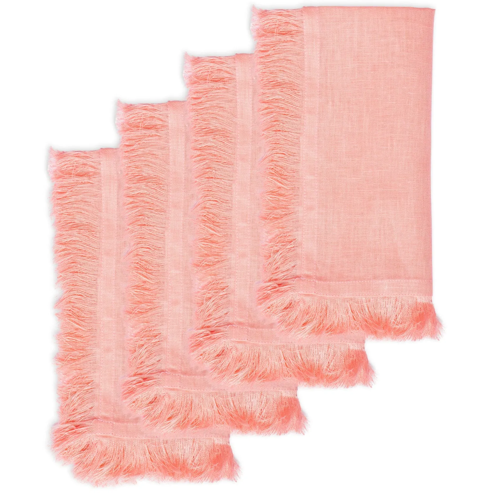 Pale salmon pink dinner napkins with a fringe edge. A colorway that works year round from Thanksgiving to Easter and back.