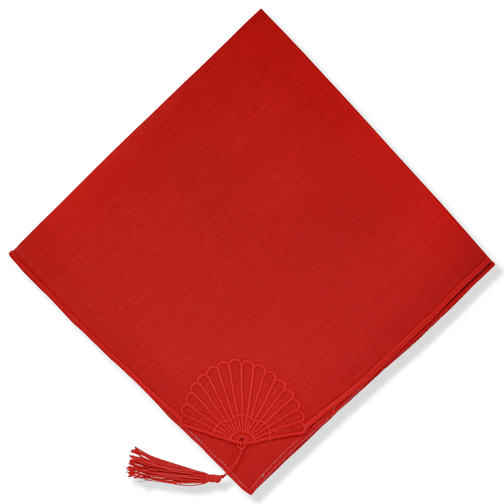 These red linen napkins fold to reveal a fan shape with dangling tassel.