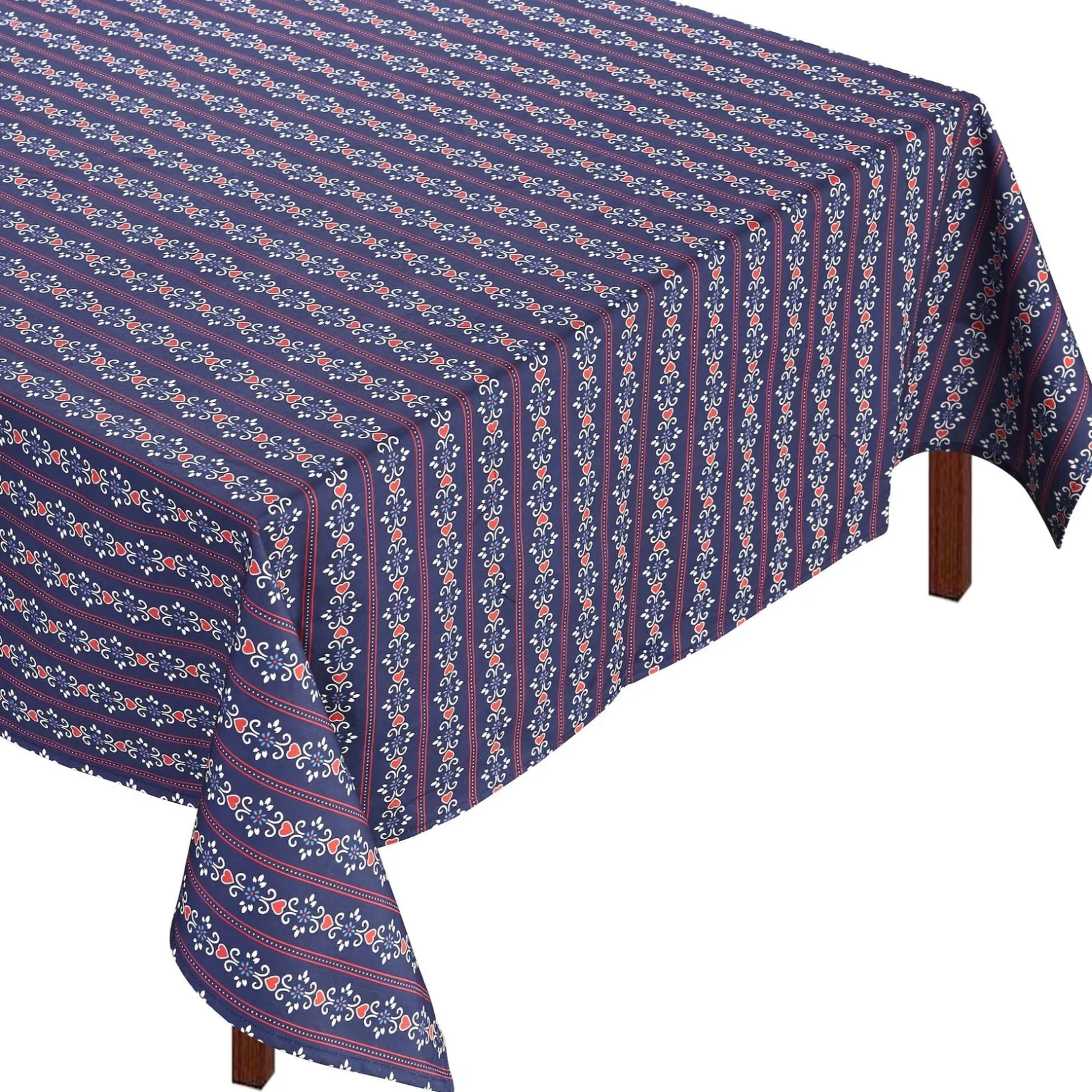 Inspired by vintage fabric, this red, white, and blue printed tablecloth features small hearts and is a festive covering for July 4, Memorial Day, Labor Day, or election night.