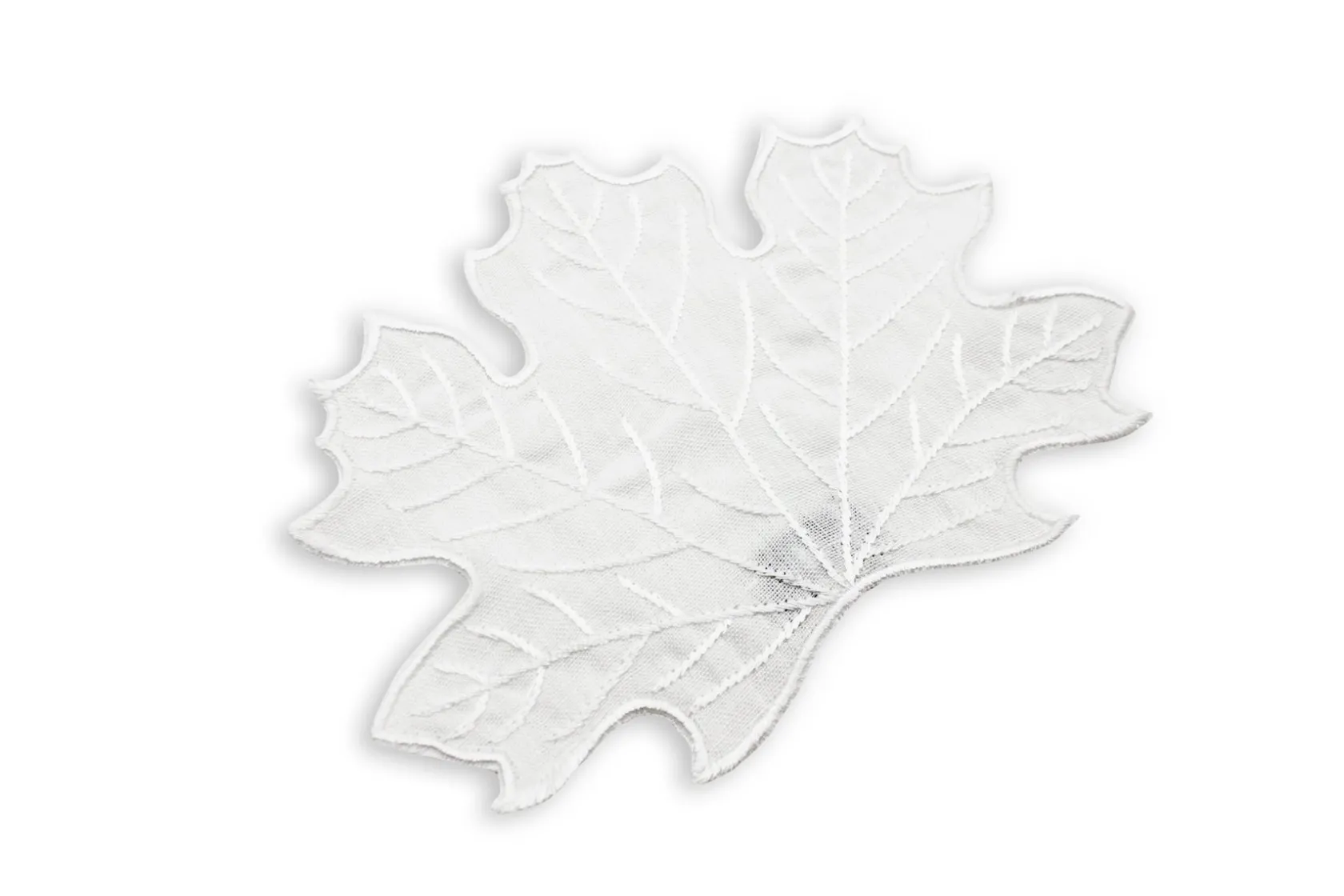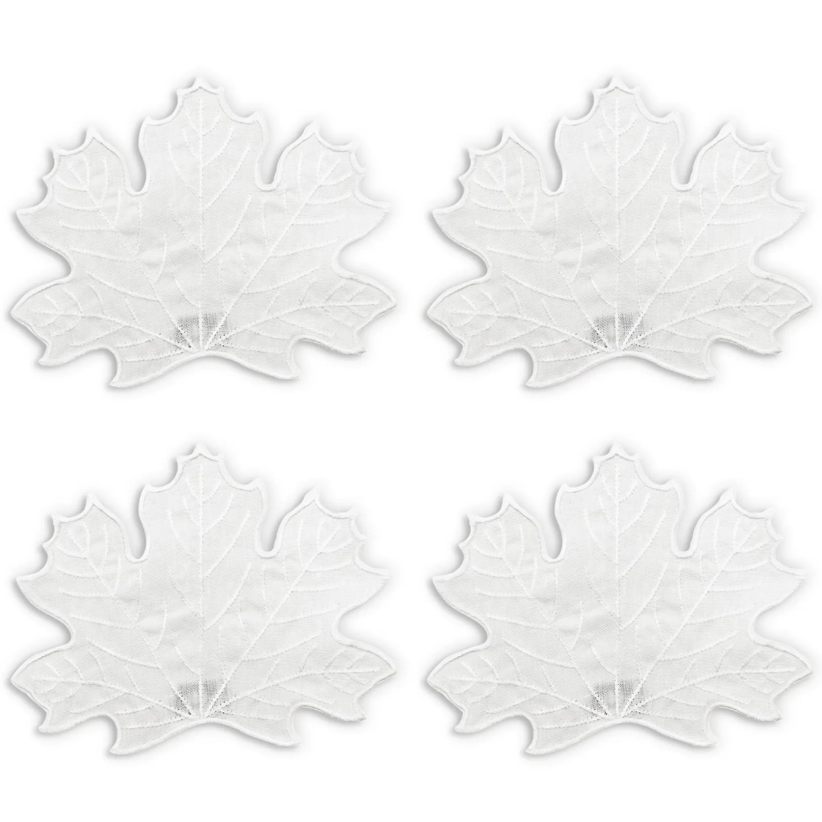 Cocktail napkins for all seasons — and the white embroidery on white linen means they can be bleached. These maple leaf-shaped napkins are perfect with all leaf tableware, including iconic lettuceware.
