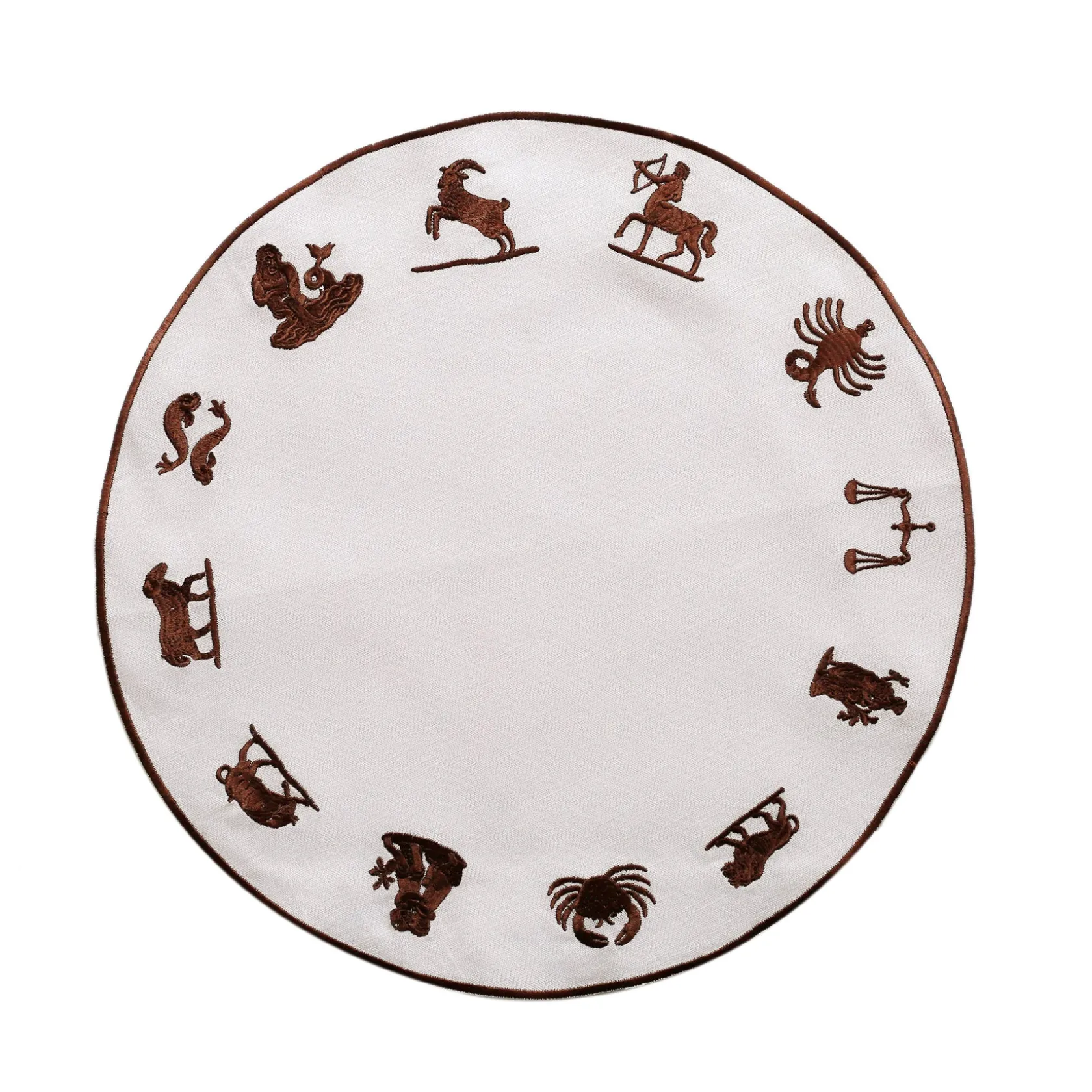 Linen fabric placemat with the zodiac wheel embroidered on the rim.